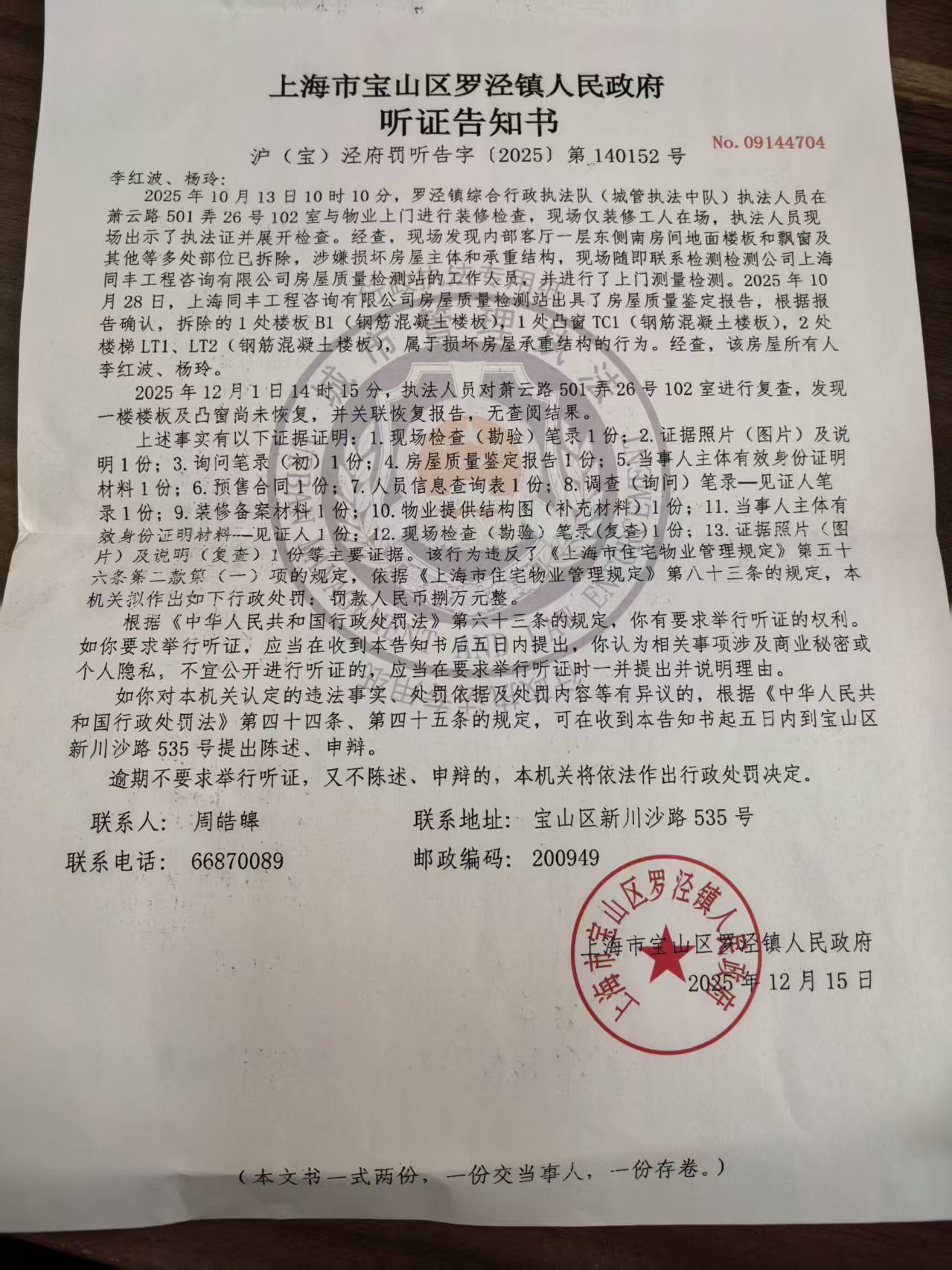 上海市宝山区罗泾镇人民政府于2025年12月15日作出沪(宝)泾府罚听告字﹝2025﹞第140152号 《听证告知书》,因你拒不配合文书签收,直接送达、邮寄送达无果,现依法向你公告送达。