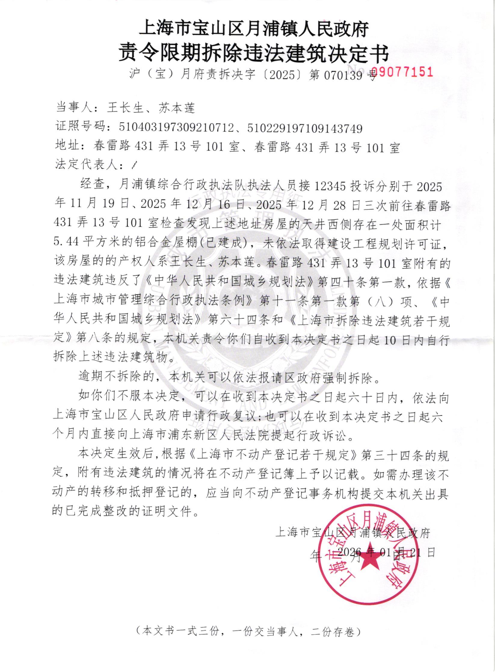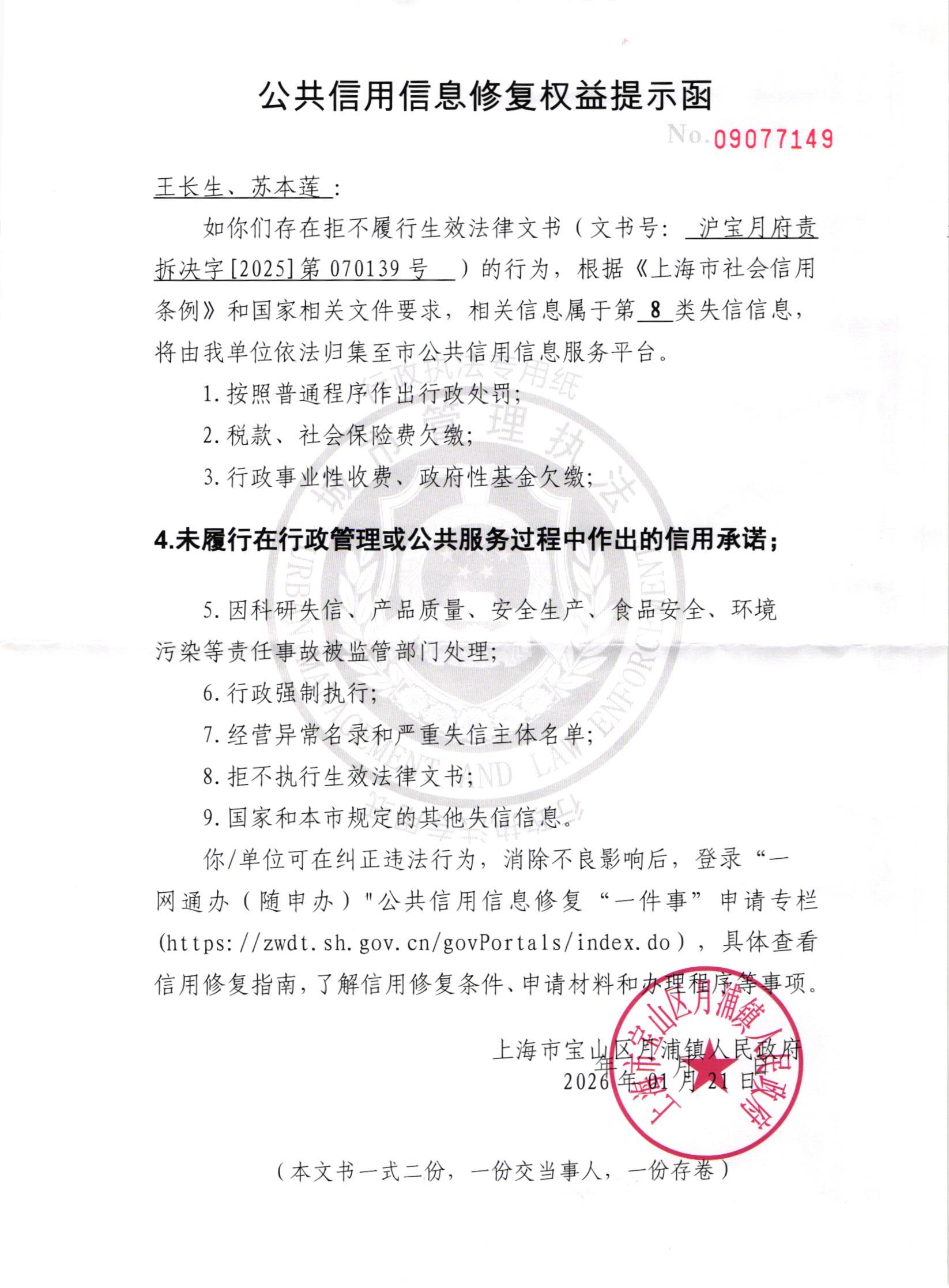 上海市宝山区月浦镇人民政府于2026年01月21日作出《责令限期拆除违法建筑决定书》沪宝月府责拆决字[2025]第070139号壹份以及《公共信用信息修复权益提示函》壹份,因采用直接送达、邮寄送达方式均无法送达,现依法向你公告送达。