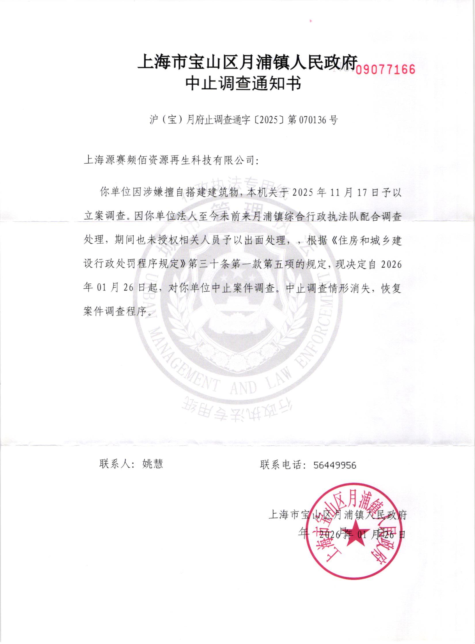 上海市宝山区月浦镇人民政府于2026年01月26日作出《中止调查通知书》沪宝月府止调查通字[2025]第070136号壹份,因采用直接送达、邮寄送达方式均无法送达,现依法向你公告送达。