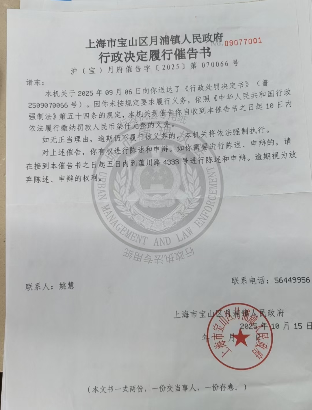 上海市宝山区月浦镇人民政府于2025年10月15日作出《行政决定履行催告书》沪宝月府催告字[2025]第070066号壹份,因采用直接送达、邮寄送达方式均无法送达,现依法向你公告送达。